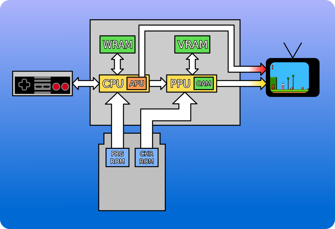 There's no audio yet. The NES APU has 5 channels (2 pulse, 1 triangle, 1 noise, 1 DMC) and adding it would probably cost 3-5ms per frame, dropping things to about 27-28 FPS. Still playable. A MAX98357A I2S DAC would handle the output side for about $1.